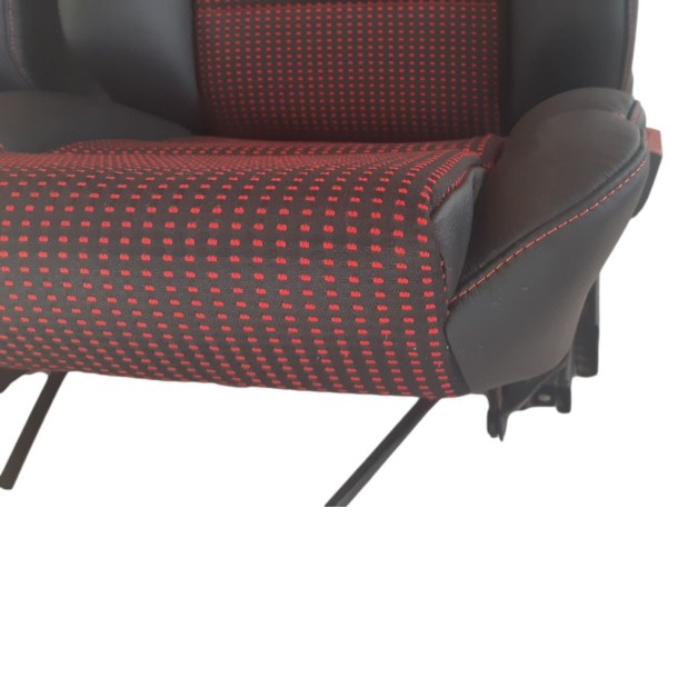 - Cuir gris anthracite sur les côtés et en tissu quartet rouge pour les parties centrales, avec toutes coutures apparentes en fil rouge.