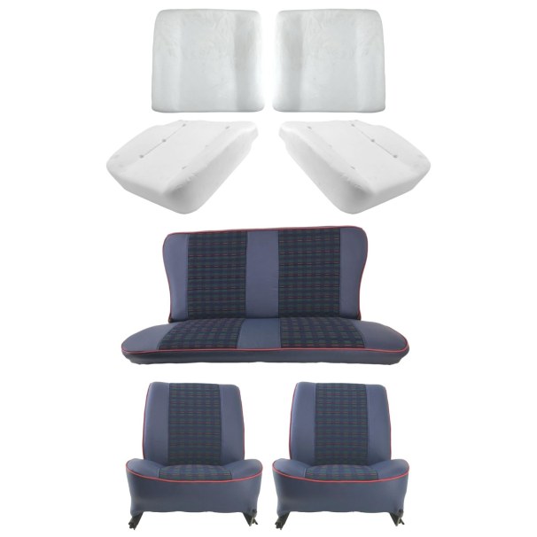 Coiffes et mousses de siège Avant + Arrière tissu écossais et simili cuir bleu compatible avec Renault 4 L à partir de 1980